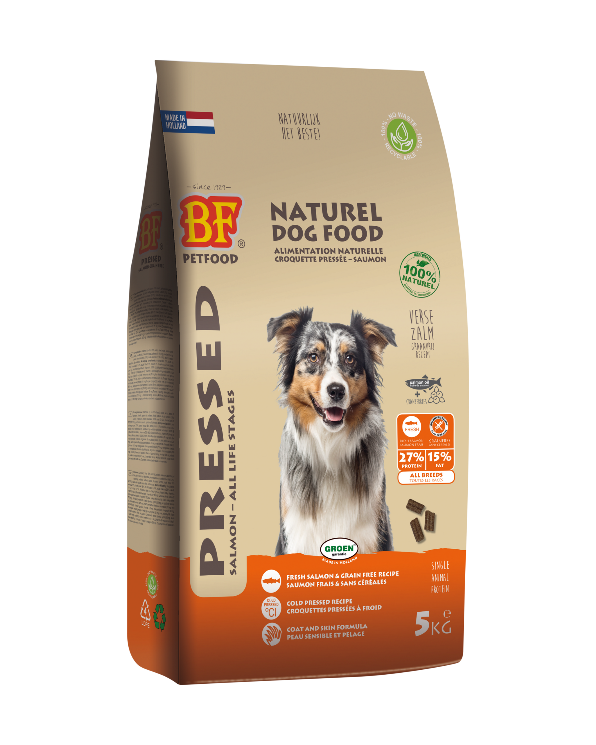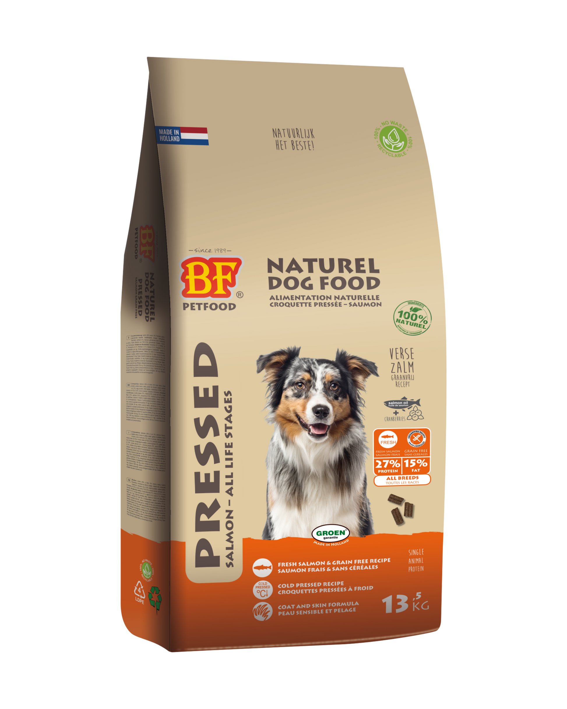 Koudgeperste hondenbrok met zalm. Hypoallergeen, licht verteerbaar en geschikt voor honden van alle leeftijden. Met Schotse zalm als enige dierlijke eiwitbron, ideaal bij allergieën. Zalmolie en cranberry ondersteunen huid, vacht en blaas. Gemaakt op lage temperatuur voor behoud van voedingsstoffen.