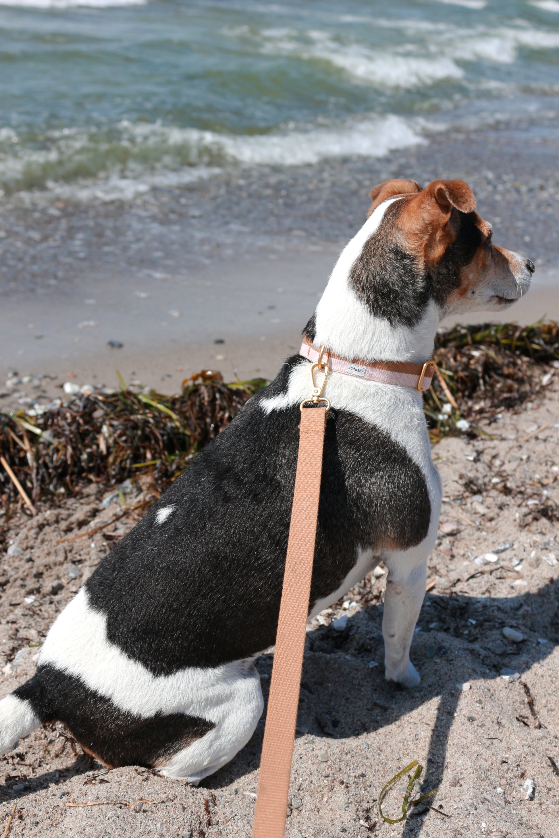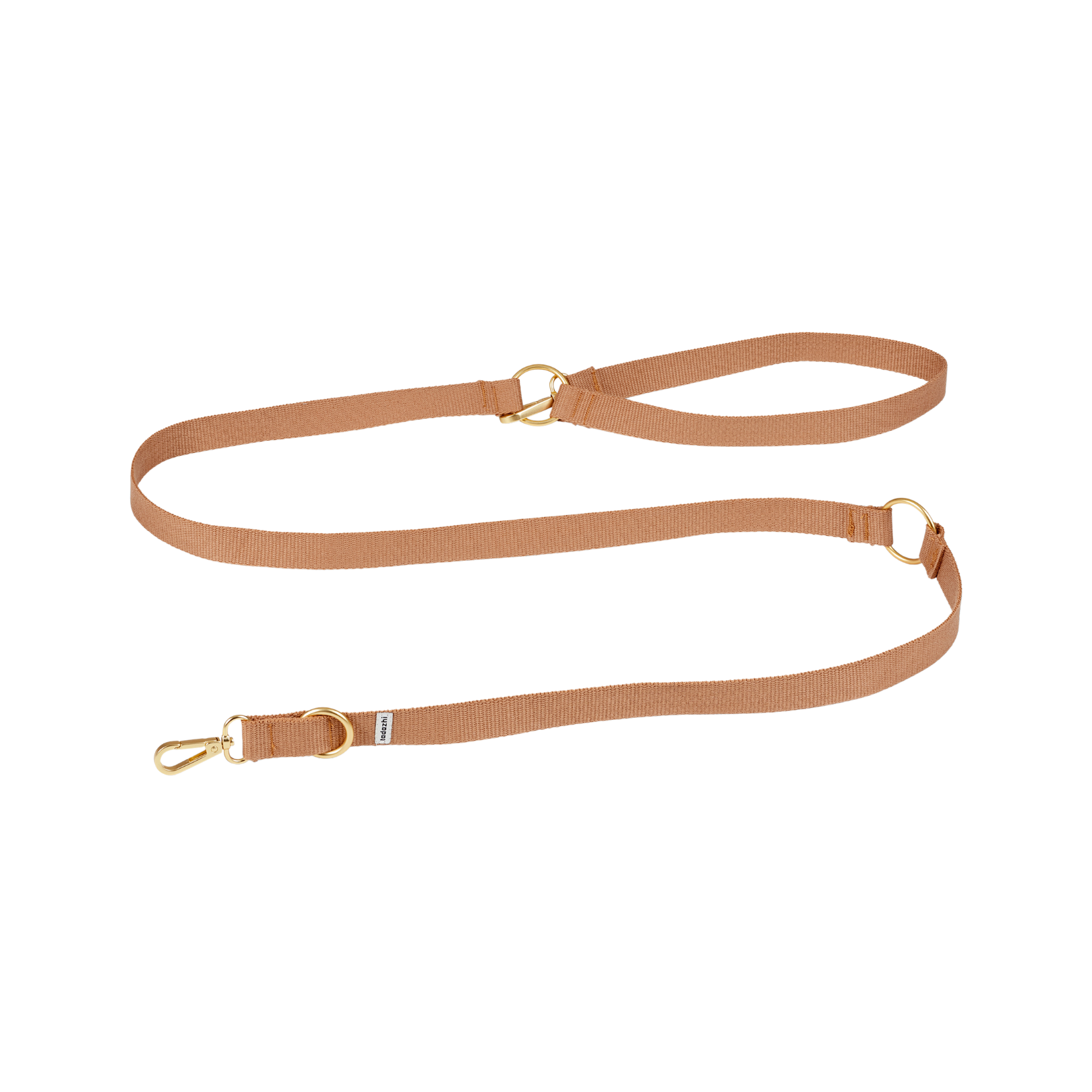 Zachte, stevige hondenriem van biologisch, gewatteerd katoen. Door het verstelbare ontwerp kies je de gewenste lengte tussen 94 en 180 cm. De mat goudkleurige metalen sluiting is stevig en bevestigd de riem veilig aan een halsband of tuigje.