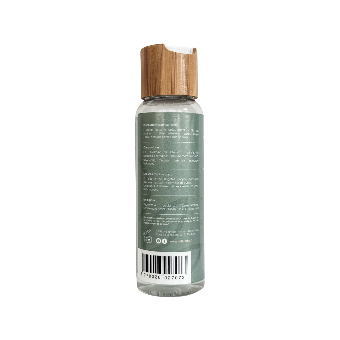 Zachte reinigingslotion met korenbloem- en kamillehydrolaat, geschikt voor honden en katten. Bevat mineralen en sporenelementen uit zeewater om te helpen bij het verminderen van irritatie, het kalmeren van de huid en het herstellen van de natuurlijke balans. Ideaal voor droge of tranende ogen, loopneus en vuile oren.
